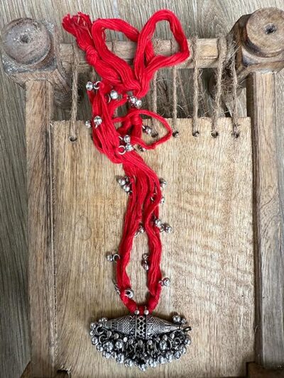 Be the first to review “Traditional Antique Silver Pendant Necklace with Red Thread and Ghungroo Bells, Tribal Design” Cancel reply