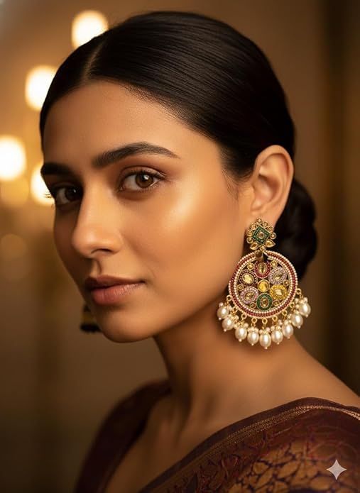 A pristine row of small pearls adds elegance along the border, while lustrous oval-shaped pearl drops create a graceful cascade below. The top features an emerald-toned floral motif studded with golden stones. These chandelier-style earrings perfectly blend vintage charm with contemporary sophistication, making them ideal for weddings, festivals and special occasions. The combination of colourful stones, pearls, and detailed metalwork creates a mesmerising play of textures that’s sure to draw admiring glances. These statement pieces effortlessly elevate both traditional and fusion ensembles.