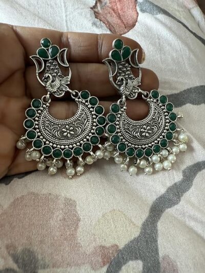 Be the first to review “Traditional Oxidized Chandbali Earrings with Green Stones and Pearl Drops, Antique Finish, Ethnic Indian Wedding Jewelry” Cancel reply
