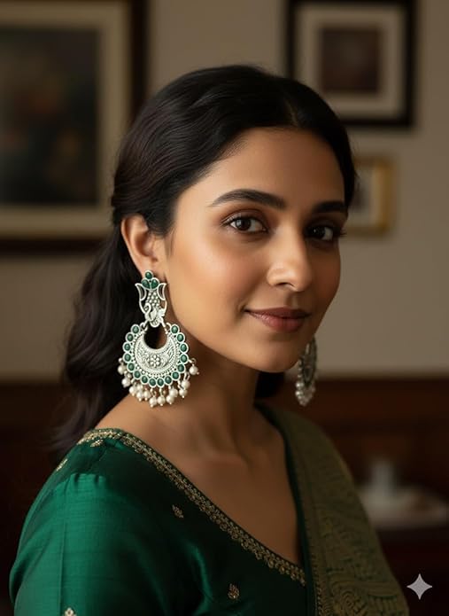 The antique finish adds a vintage charm that perfectly complements both traditional and contemporary attire. These statement pieces measure approximately 7.5 centimetres in length, making them ideal for special occasions, festivals, or wedding celebrations. The combination of emerald-hued stones and pearl drops creates a sophisticated contrast against the oxidized silver backdrop. These versatile Chandbalis are perfect for pairing with traditional Indian outfits like sarees, lehengas, or suits, adding a touch of royal elegance to your ensemble.