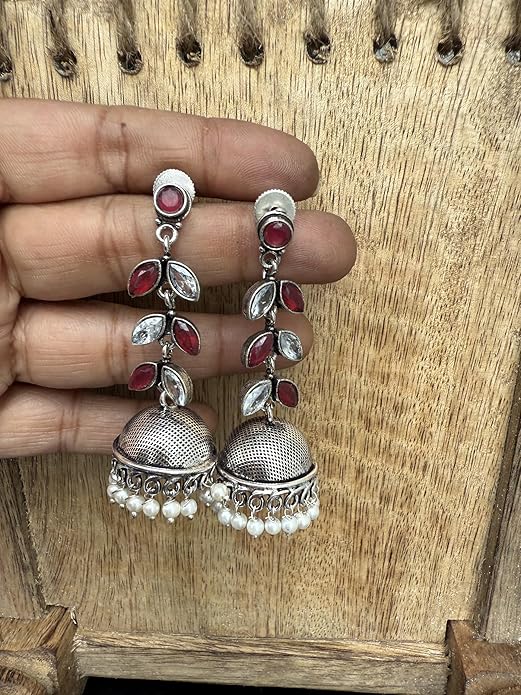 Elevate your traditional ensemble with these exquisite jhumka earrings featuring an intricate blend of red and clear stones in a leaf-like pattern. The antique silver-toned design showcases delicate craftsmanship with a mesh-textured dome adorned with graceful scroll work detailing.
