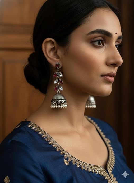 Be the first to review “Traditional Silver Jhumka Earrings with Red and White Stones, Pearl Drops, Antique Ethnic Design, Wedding Jewellery” Cancel reply