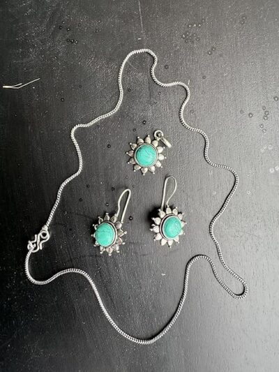The set’s bohemian-inspired aesthetic combines timeless elegance with artistic flair, perfect for both special occasions and everyday wear. The sterling silver chain and settings ensure durability and lasting beauty, while the natural turquoise stones add a pop of vibrant colour. Each piece is meticulously crafted to highlight the unique character of the turquoise stones. The necklace’s pendant makes a bold yet sophisticated statement, while the coordinating earrings complete the look with balanced proportions. This versatile set pairs beautifully with both contemporary and traditional attire, making it an excellent addition to any jewellery collection.