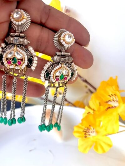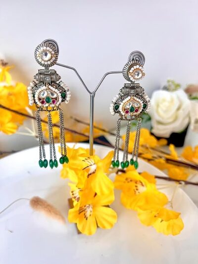 Be the first to review “Vintage Style Chandelier Earrings, Green Beaded Tassels, Antique Silver Chain, Red and Green Stone Accents”