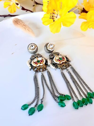 • CHAIN TASSELS: Multiple antique silver-tone chain tassels with emerald green beaded drops create dramatic movement