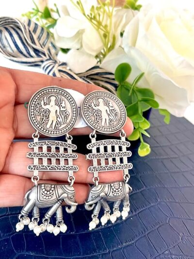Be the first to review “Vintage Style Oxidised Silver Elephant Dangle Earrings with Pearl Beads, Tribal Design” Cancel reply